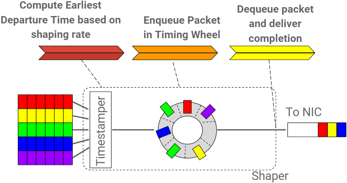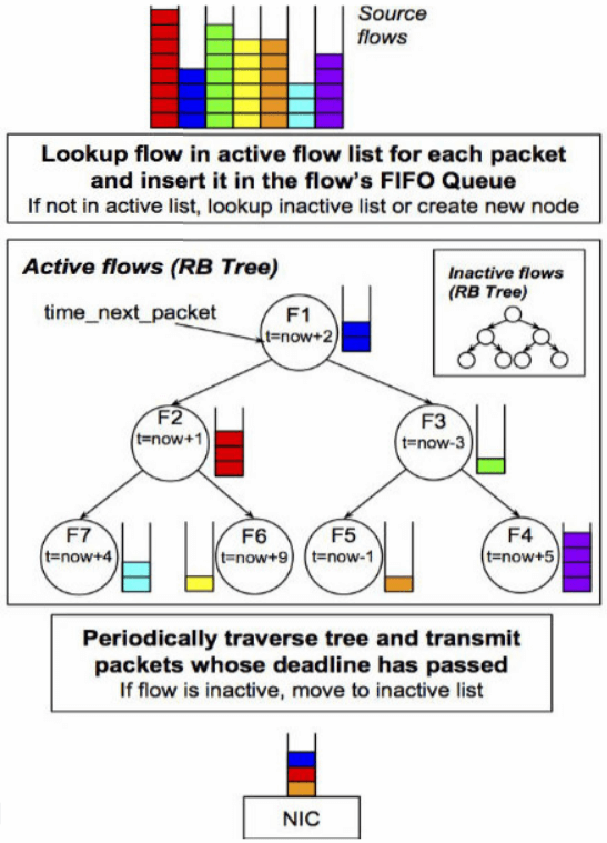 用一个时间轮调度器(timing-wheel scheduler)代替原来 网卡前或网卡中的发包缓冲队列(queue)。