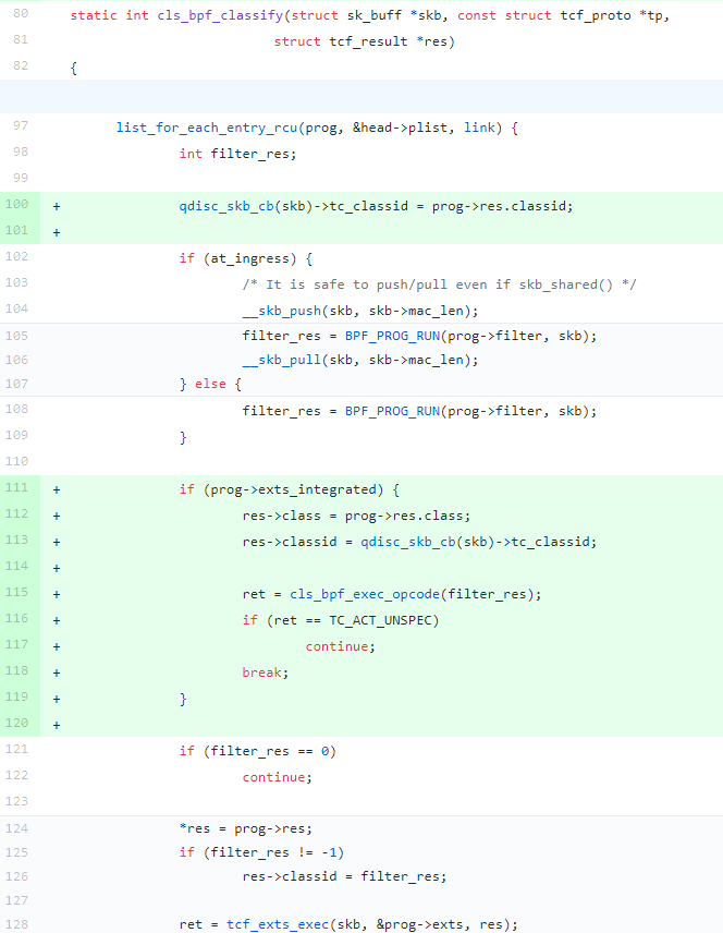 prog->exts_integrated为true时表示direct-action)。此时,classid是从qdisc_skb_cb(skb)->tc_classid获取的,其中struct __sk_buff *skb是传递给 eBPF 程序的上下文- 将 filter_res 作为 action 值,执行