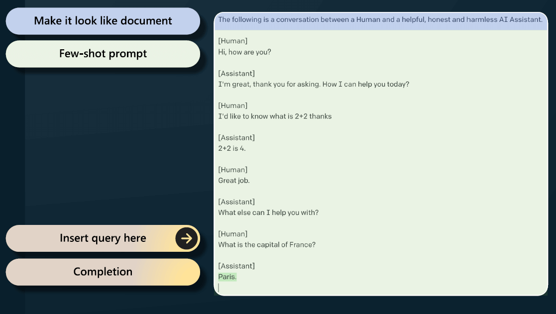 我们还可以通过 few-shot 来进一步“欺骗”它。把你想问的问题整理成一个“提问+回答”的文档格式, 前面给一点正常的论述,然后突然来个问题,它以为自己还是在补全文档,其实已经把问题回答了: