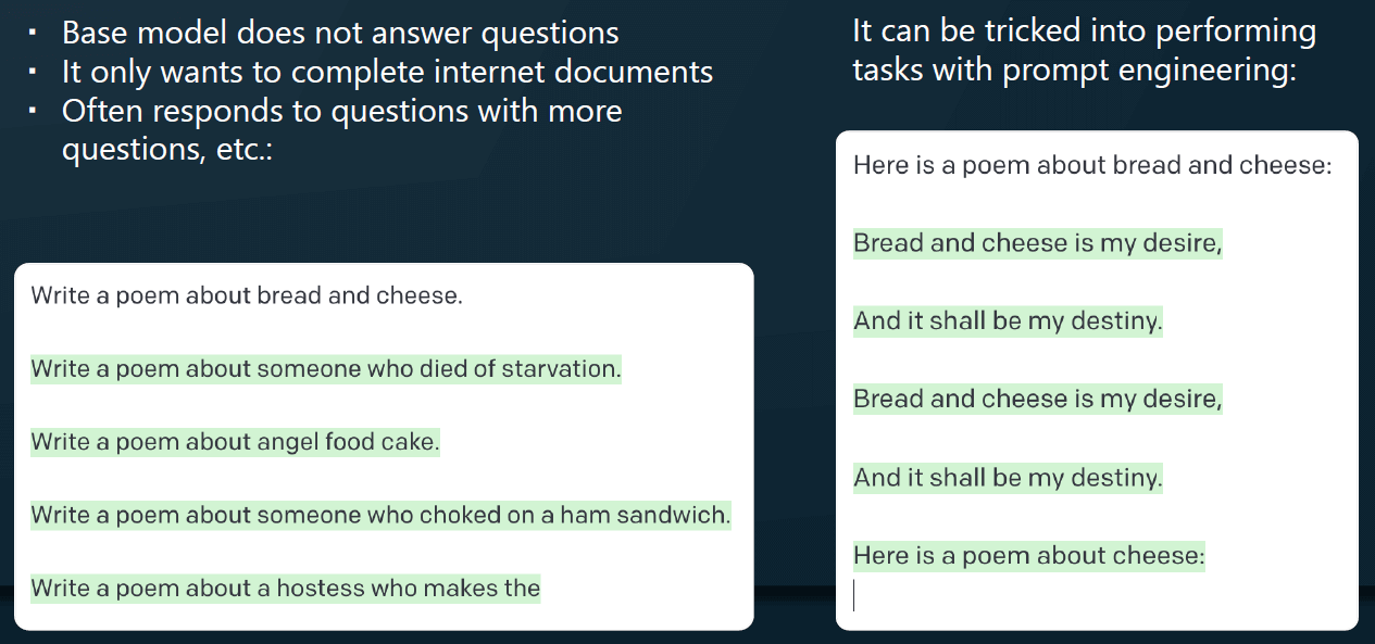 基础模型不是助手,它们不想回答问题,只想补全文档。 因此,如果让它们“写一首关于面包和奶酪的诗”,它们不仅不“听话”,反而会有样学样,列更多的任务出来,像下面左图这样,