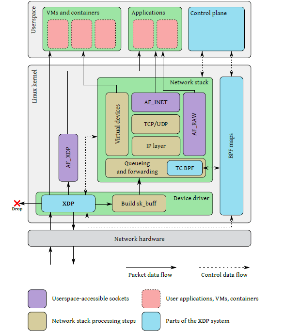 - XDP 是主线内核(mainline Linux kernel)的一部分,与现有的内核 网络栈(kernel’s networking stack)完全兼容,二者协同工作。