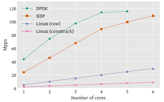 我们的测试结果显示 XDP 能取得 24Mpps/core 的处理性能,这虽然与 DPDK 还有差距,