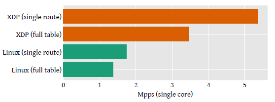- 测试结果显示,XDP 能达到 24Mpps/core 的处理性能。